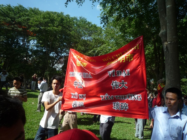 12h48: Hiện tại, tại Tp Hồ Chí Minh vẫn còn một nhóm khoảng 30 người ở trước Lãnh sự quán TQ. Có một bạn trẻ đã đứng ở đó trong khoảng 1 giờ đồng hồ giương biểu ngữ tiếng Việt và tiếng Anh. Chốc chốc, các bạn đến đưa nước và lau giúp mồ hôi cho người thanh niên này, đang đứng giữa nắng trưa Sài gòn.